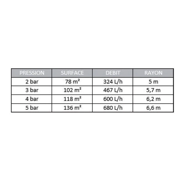 | 3 bar | 102 m² | 467 L/h | 5,7 m |