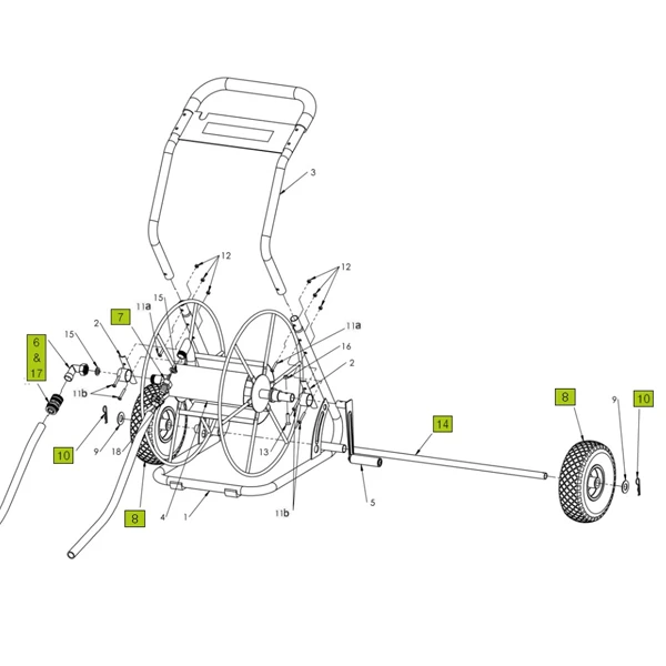 | Repère sur la vue éclatée Dévidoir 2 roues 85 mètres de tuyau d’arrosage | 14 |